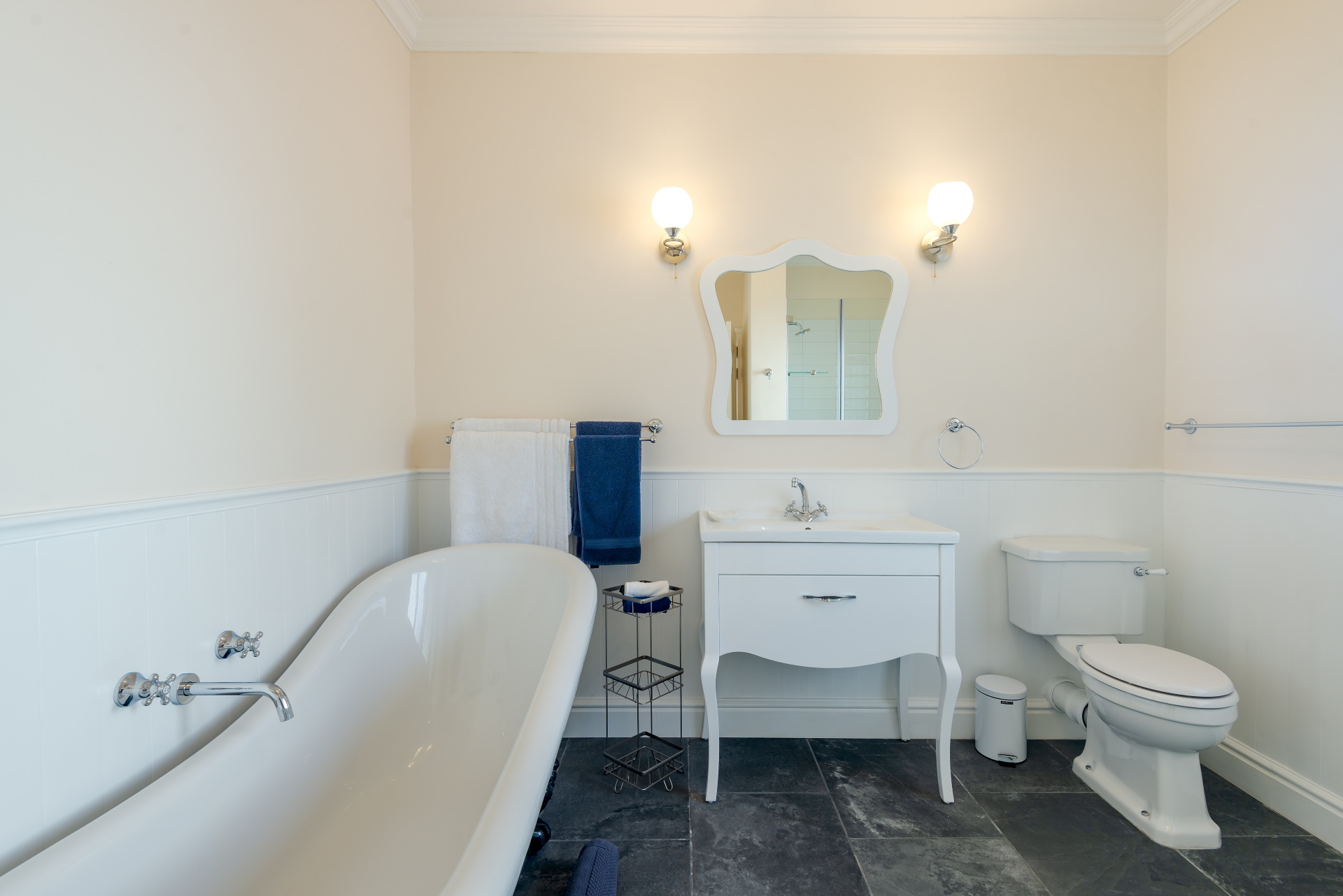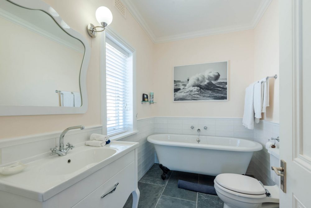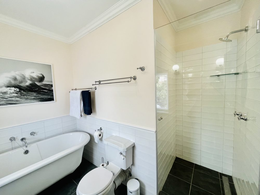 The half-tiled bathroom features a shower and slipper bath, and looks out southward.