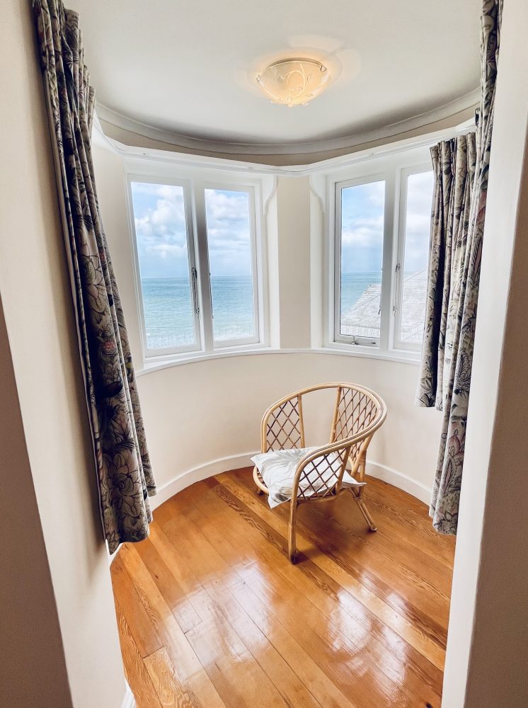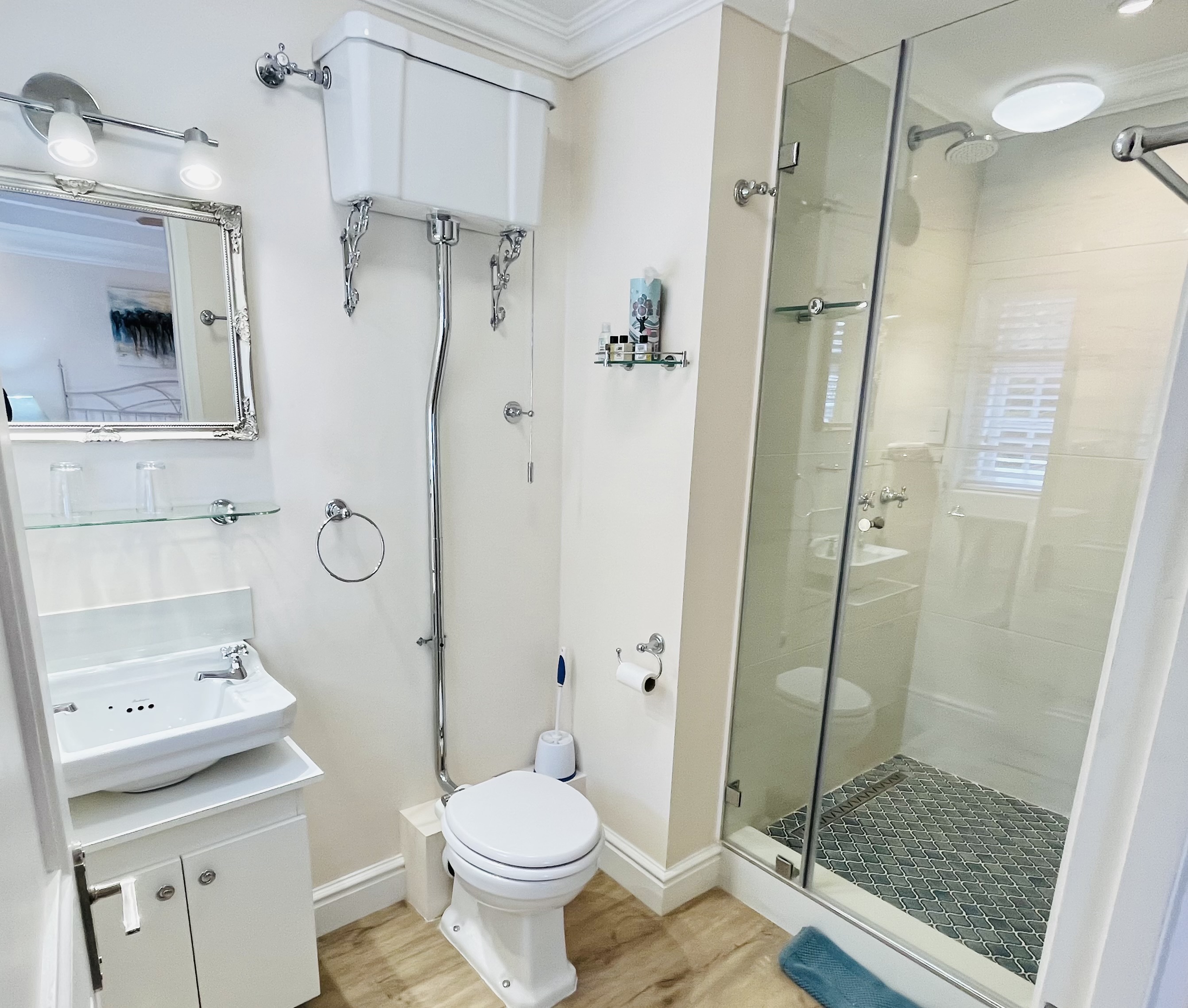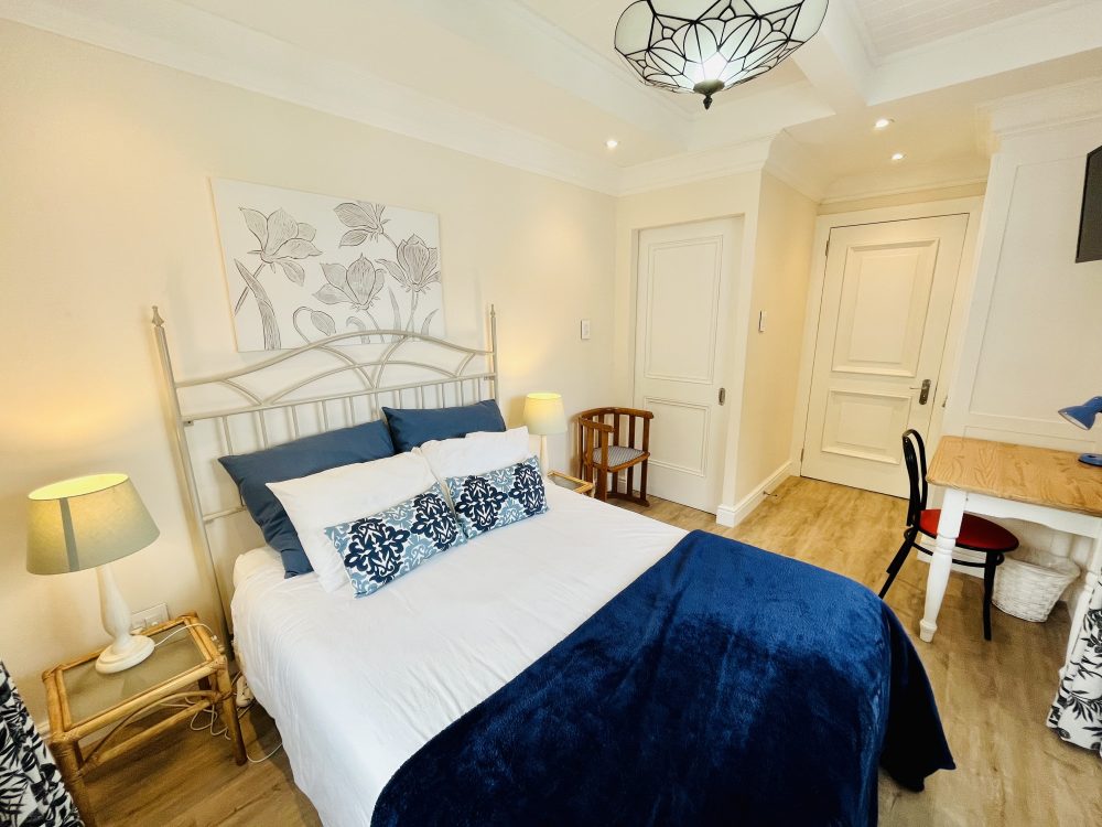 This light and attractive room offers a mountain view (no sea view), towards Elsie’s Peak, which soars over Fish Hoek and fascinates in all its changing moods. Cosy and comfortable, the king-size bed (can be converted to 2 x single beds by prior arrangement) welcomes the tired traveller. The elegant bathroom has a spacious shower and cistern toilet andis well-lit by a large window. The ornate celling gives the room a distinctive character, and the bright curtains have block-out linings to enhance your rest. No need to heave your luggage up the staircase, either; our luggage lift transports your bags effortlessly to your door.