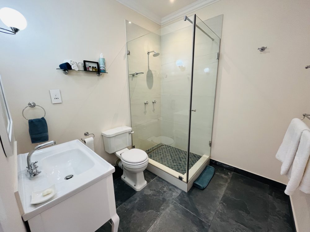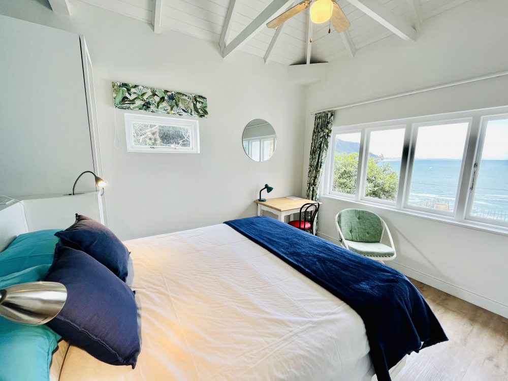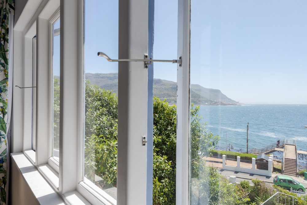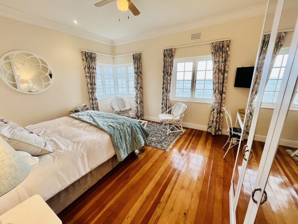 The king-size bed (can be converted to 2 x single beds by prior arrangement) backed by an elegant wrought-iron headboard that faces the windows which provide a direct view over the sea. The corner windows look towards Kalk Bay and its mountain. Welcoming and elegantly furnished, the room with its polished pine floors, indigenous art and spaciousness promise a rewarding stay. The bathroom features a tube light to provide natural light during the day, and the shower offers a view of Kalk Bay mountain.