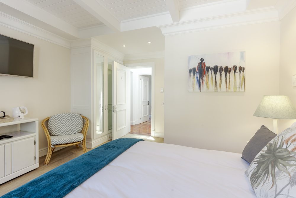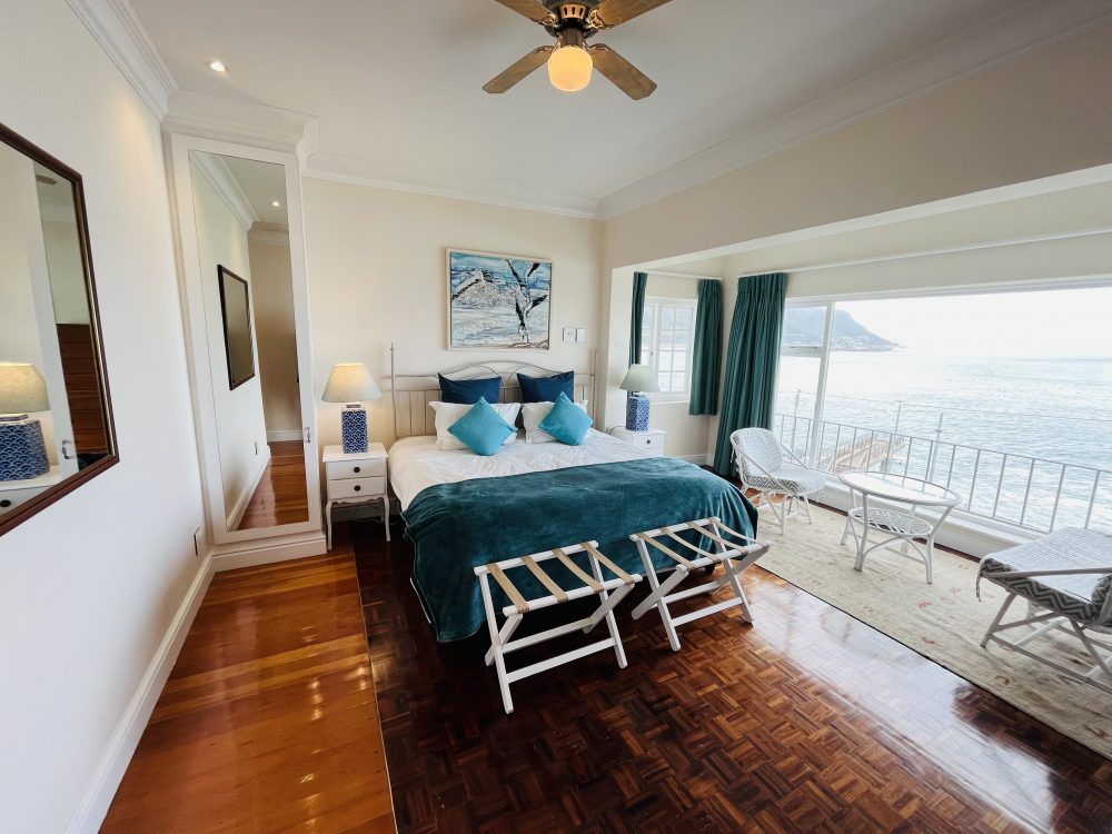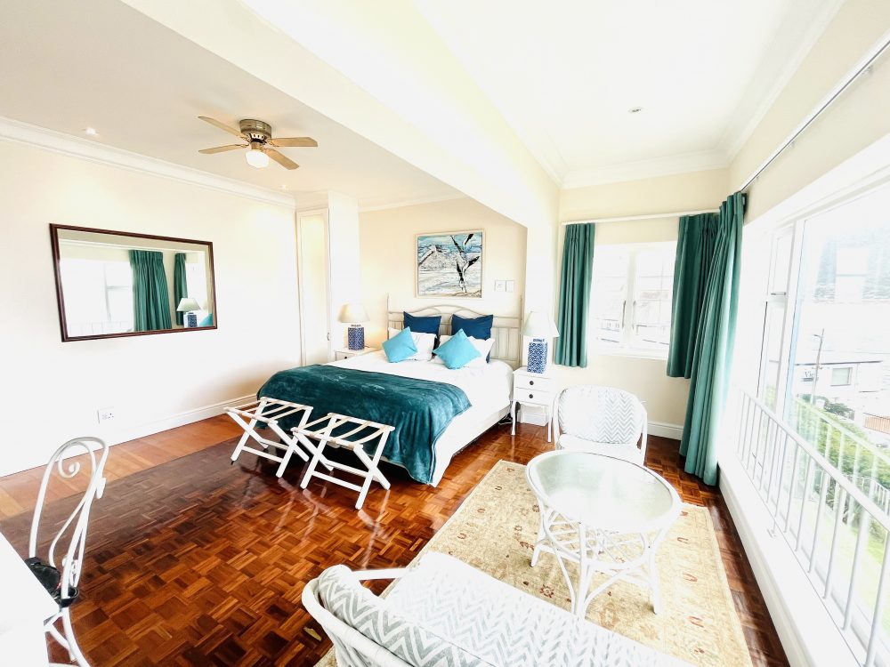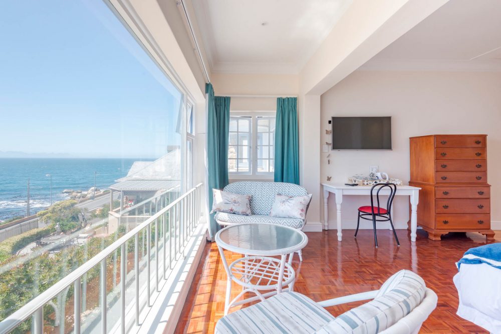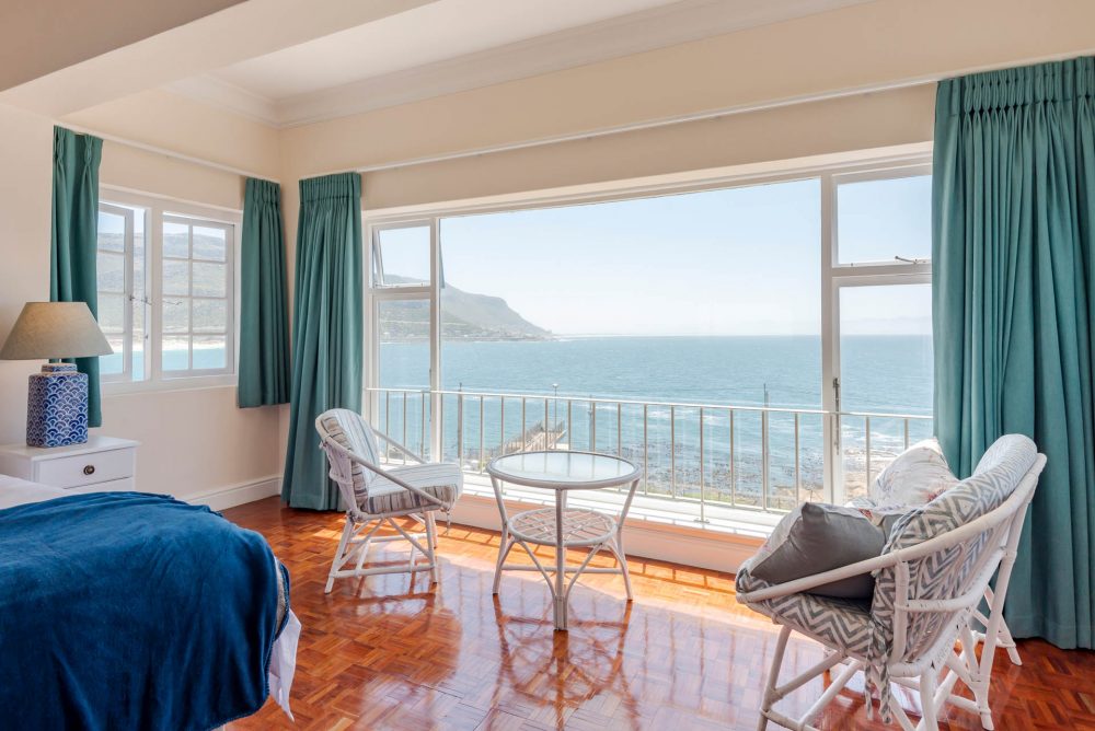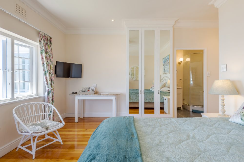 The focal point of this alluring room is the immense picture window, which frames the view over False bay to the Helderberg and Cape Hangklip in the distance. White cane chairs and couch set in front of the faux-Juliet balcony provide a comfortable spot for relaxing and taking in the wonderful outlook. The room has a king-size bed (can be converted to 2 x single beds by prior arrangement) with wrought-iron headboard. Wall mirrors reflect the light, and the colour scheme in sea blues and greens is designed to sooth the nerves.