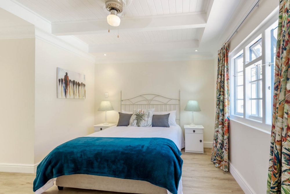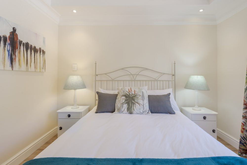 From the open vaulted ceiling to the built-in headboard and platform queen-size bed, this room is dramatic and different. The platform bed has concealed drawers for storing your luggage, and built-in bedside lights and cupboards. The mirrored closets and eye-catching back wall reflect the beautiful view of False Bay and its surrounding mountains. The curtains bring the outdoor world of birds indoors, providing a touch of nature.