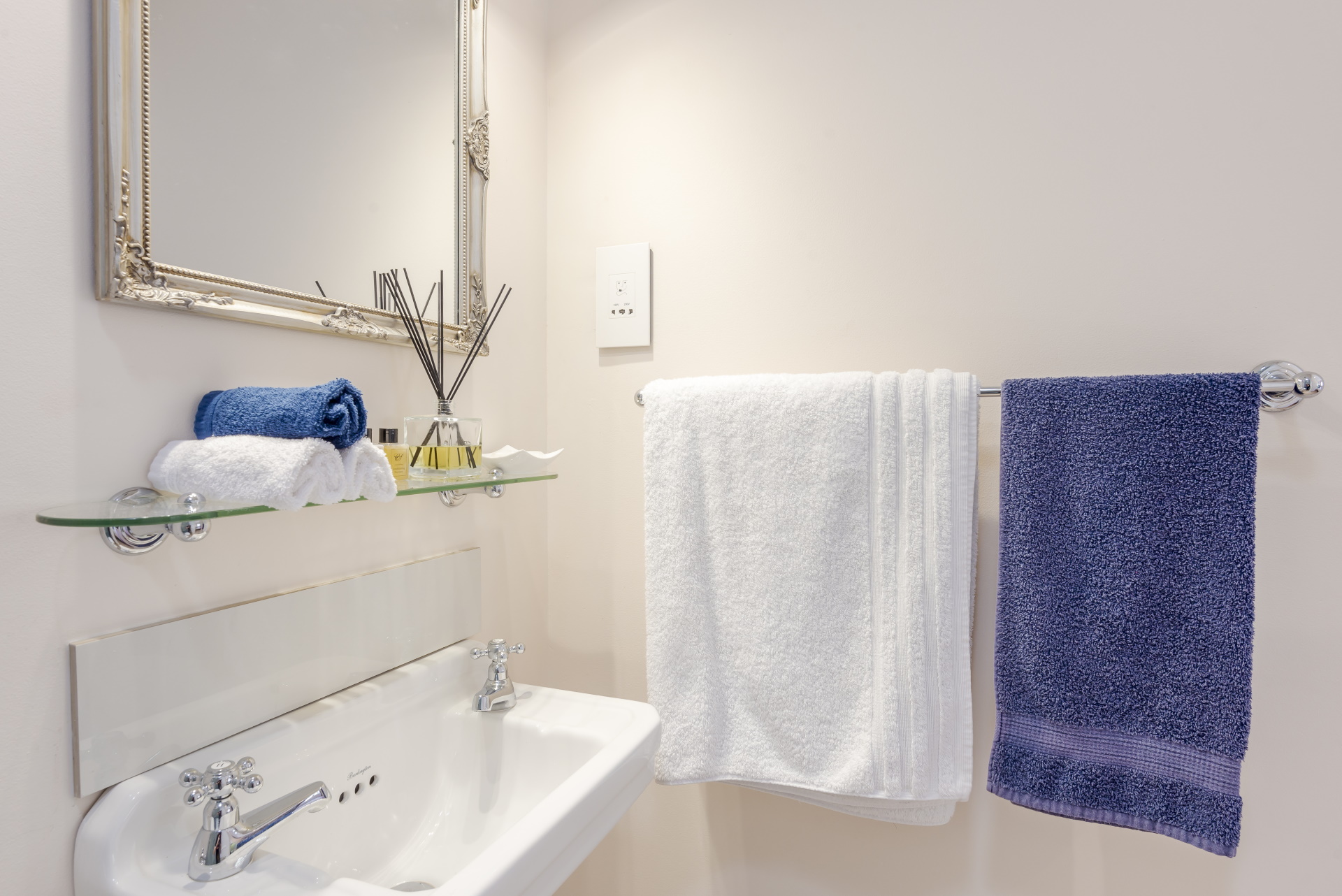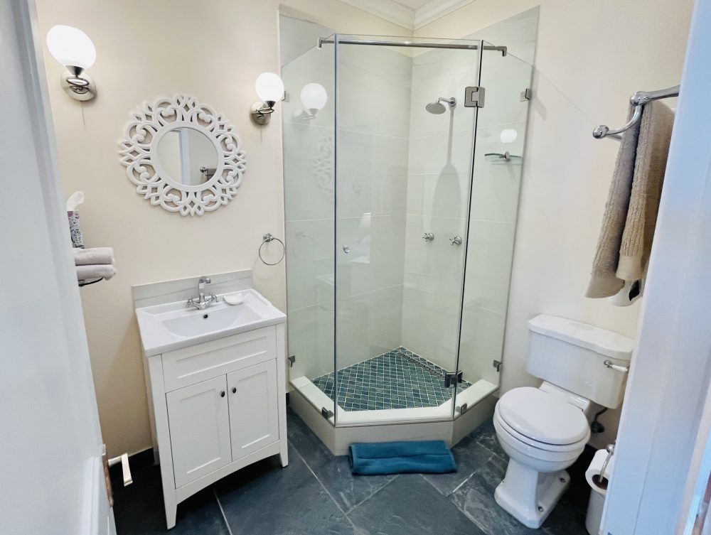 The spacious bathroom features a tube light to provide natural light during the day, and the roomy shower is inviting.